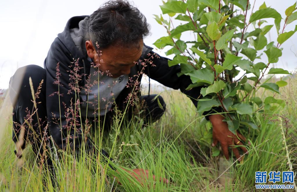 索朗羅布在檢查樹的長(zhǎng)勢(shì)(2020年8月8日攝)。新華社記者 覺果 攝