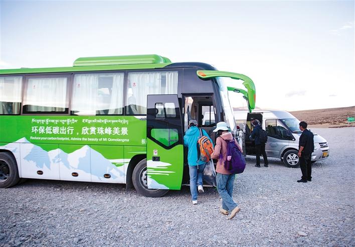 游客在珠穆朗瑪峰景區(qū)停車場轉(zhuǎn)乘環(huán)??蛙嚕?019年5月16日攝)。珠穆朗瑪峰景區(qū)內(nèi)自2019年5月開始試運營清潔能源環(huán)??蛙?,以進(jìn)一步平衡珠峰地區(qū)旅游發(fā)展與環(huán)境保護(hù)需要。新華社記者 孫非 攝