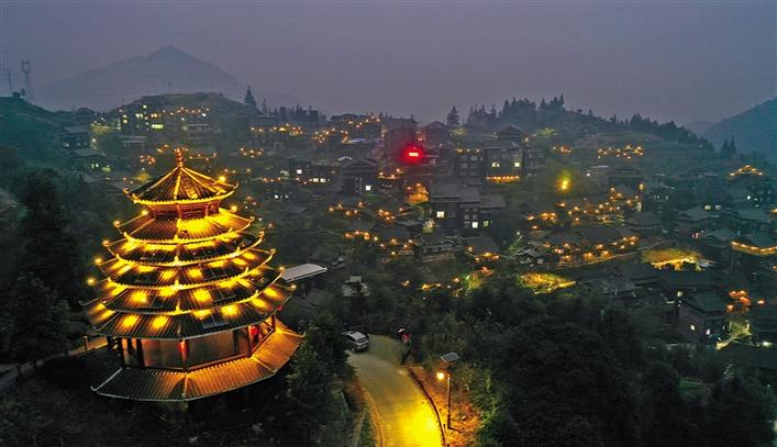 在廣西柳州市三江侗族自治縣八江鎮(zhèn)布央村,太陽能路燈和鼓樓上的太陽能裝飾燈讓鄉(xiāng)村的夜晚亮了起來(2020年12月28日攝,無人機(jī)照片)。 新華社發(fā) (黎寒池 攝)