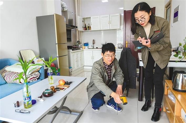 河北省安平縣一家熱力公司員工入戶測量室內(nèi)地暖溫度(2019年11月15日攝)。2018年以來,安平縣利用玉米秸稈等農(nóng)林廢棄物大力推行生物質(zhì)能源供熱的供暖模式,減少污染排放,綠色節(jié)能型能源走進(jìn)了千家萬戶。 新華社記者 李曉果 攝