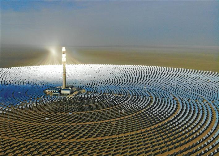 在甘肅省敦煌市向西約20公里處,被稱為“超級鏡子發(fā)電站”的首航高科敦煌100兆瓦熔鹽塔式光熱電站在戈壁灘上閃耀(2021年2月24日攝,無人機(jī)照片)。新華社記者 馬希平 攝