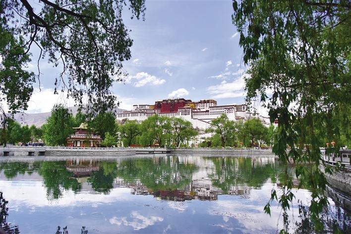 記者來到布達(dá)拉宮廣場(chǎng),看到有很多游客在湖邊拍照,湖面清澈得像一面鏡子,倒映著布達(dá)拉宮。這么美的畫面,小編也忍不住用相機(jī)記錄下來與大家分享。
