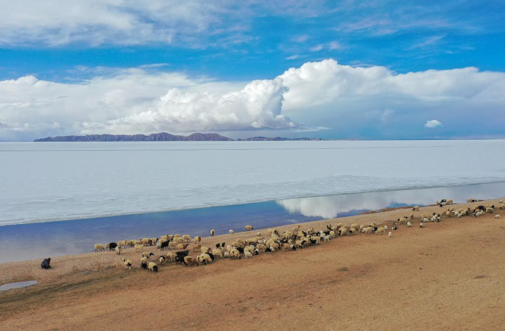 牧民指揮羊群從色林錯(cuò)經(jīng)過(guò)(2020年4月29日無(wú)人機(jī)攝)。新華社記者田金文 攝