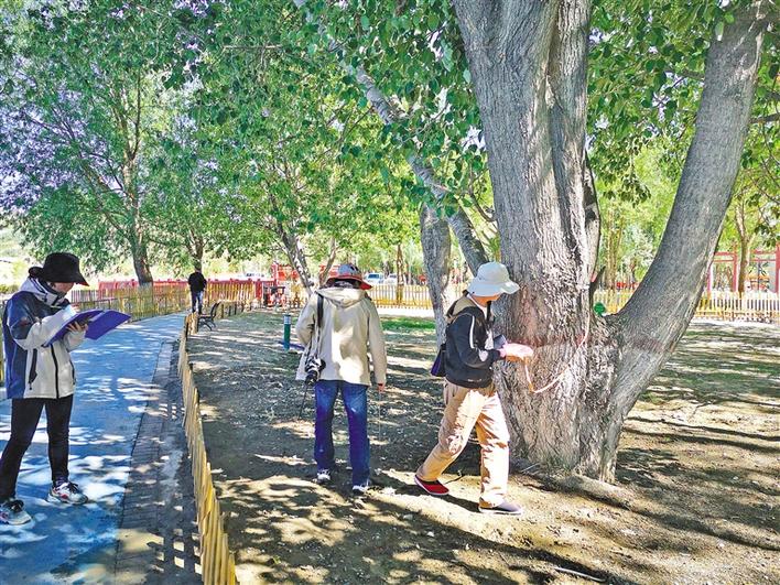 圖為西藏農牧學院的師生在測算貢覺林卡內古樹的相關數(shù)據。記者 扎西頓珠 攝
