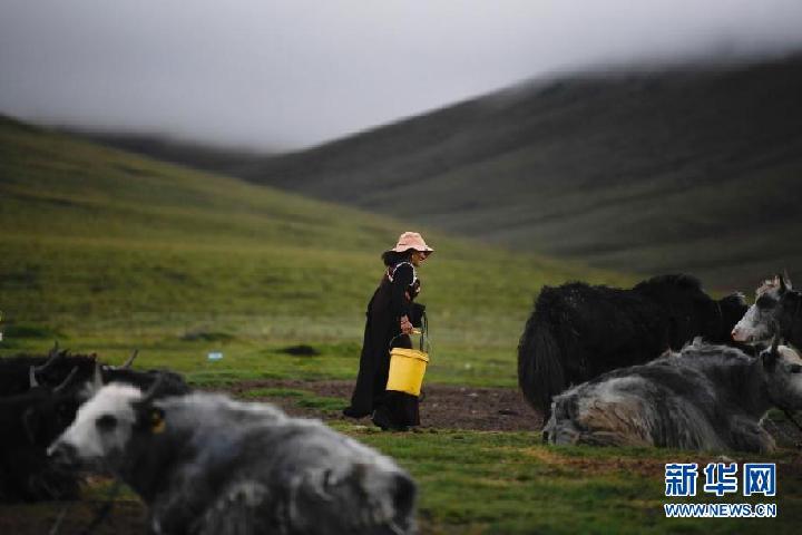 8月3日,在果洛州瑪沁縣當(dāng)洛鄉(xiāng)貢龍村的夏季草場上,牧民準(zhǔn)備擠牛奶。新華社記者 張龍 攝