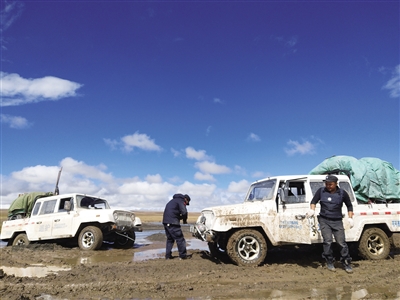 可可西里巡山隊隊員在巡山途中??煽晌骼锕芾硖幑﹫D