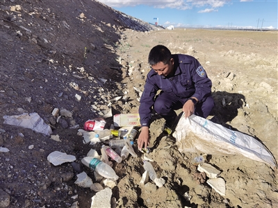 可可西里索南達杰保護站工作人員在109國道沿線撿拾被丟棄的垃圾??煽晌骼锕芾硖幑﹫D