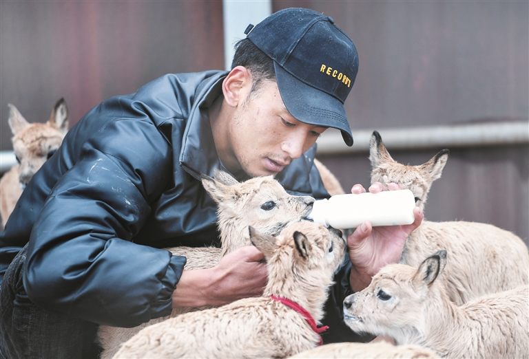 圖為可可西里國家級自然保護區(qū)卓乃湖保護站的工作人員才文多杰在給藏羚羊幼仔喂奶(2020年7月7日攝)。 新華社記者 薛玉斌攝