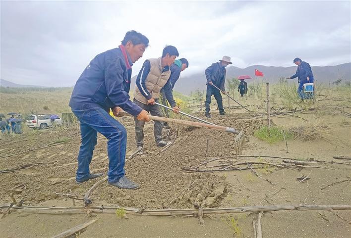 圖為農(nóng)牧民群眾在山南市全國防沙治沙綜合示范區(qū)的沙地上種草。記者 史金茹 攝