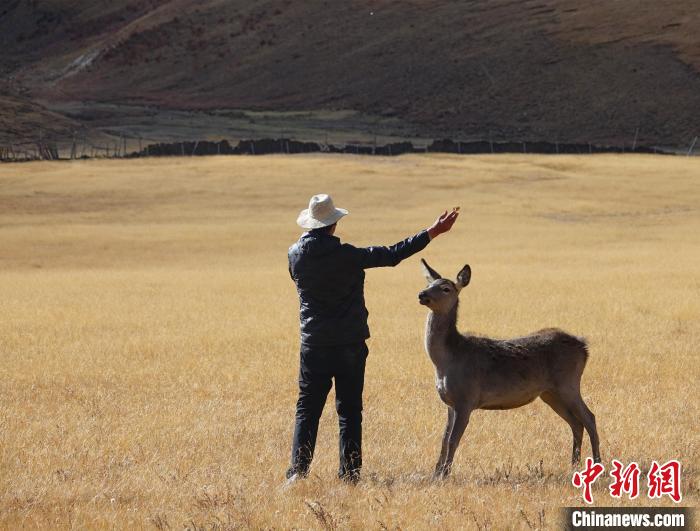 圖為西藏類(lèi)烏齊馬鹿國(guó)家級(jí)自然保護(hù)區(qū)的管護(hù)員正在飼喂馬鹿。 冉文娟 攝