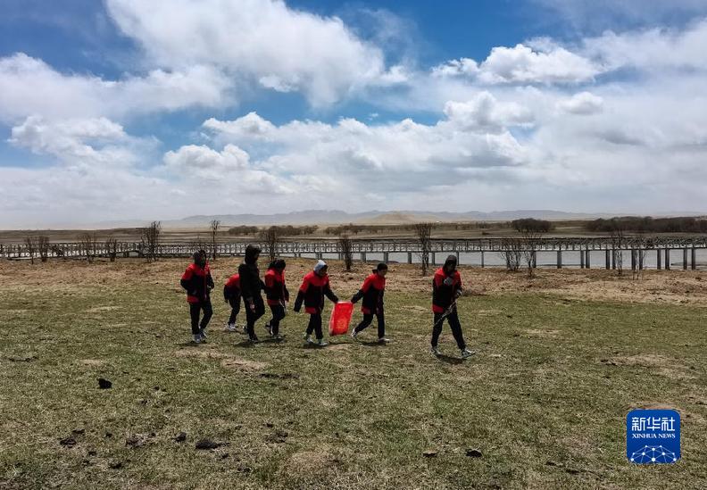 學校學生到九曲黃河第一彎清理白色垃圾。(唐克九年一貫制學校供圖)