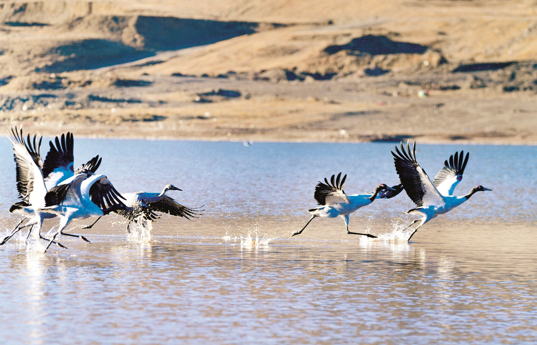 這是在林周縣虎頭山水庫(kù)拍攝的黑頸鶴(12月7日攝)。(新華社發(fā))