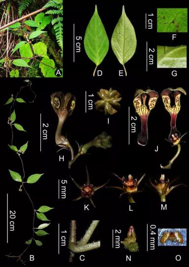 2021年7月中旬至8月初,由西雙版納植物園星耀武研究員率隊(duì)的聯(lián)合考察隊(duì),對(duì)西藏日喀則地區(qū)喜馬拉雅南坡的維管植物進(jìn)行了考察和標(biāo)本采集??疾烊藛T在吉隆縣薩勒鄉(xiāng)發(fā)現(xiàn)一種正處于盛花期的吊燈花屬未知植物。通過解剖拍照、文獻(xiàn)查閱及相似種的模式標(biāo)本核對(duì)后,最終確認(rèn)為一新種。根據(jù)其模式產(chǎn)地,將其命名為吉隆吊燈花(Ceropegia jilongensis)。