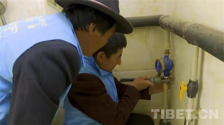 圖為洛隆縣俄西鄉(xiāng)貢中村水管員嘎松旺修為群眾安裝水表