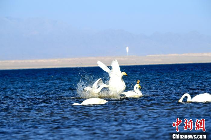 圖為天鵝群在湖中展翅?!〈饔婪?攝