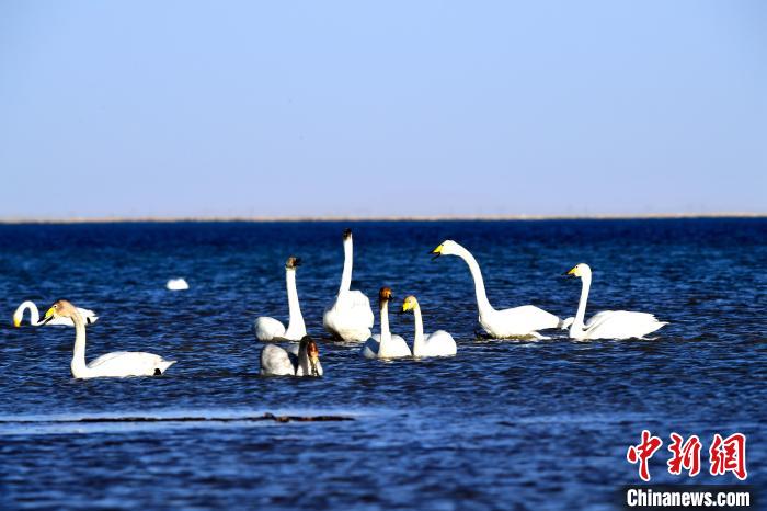 圖為天鵝群在湖中游蕩?!∏嗪6嗝郎鷳B(tài)環(huán)??萍加邢薰?供圖