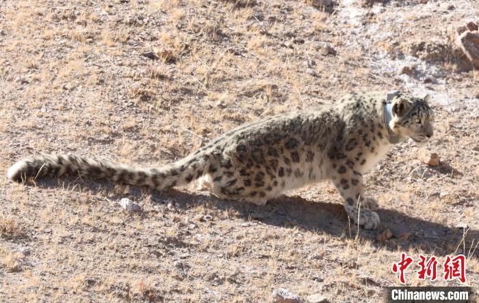圖為佩戴衛(wèi)星追蹤項(xiàng)圈的雪豹被放歸。 祁連山國(guó)家公園青海省管理局供圖