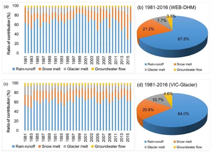 王磊表示,依托監(jiān)測網(wǎng)絡(luò)和其他多源數(shù)據(jù),研究團隊生成了1981-2019年這38年內(nèi)雅魯藏布江流域高時空分辨率降水數(shù)據(jù),在此基礎(chǔ)上進一步通過對比、綜合主流冰凍圈水文模型的徑流組分模擬,研究得出的結(jié)果顯示,雅魯藏布江流域(奴下水文站以上)新的降雨、融雪、冰川融化和地下水補給分別占總徑流的66%、21%、9%和4%。