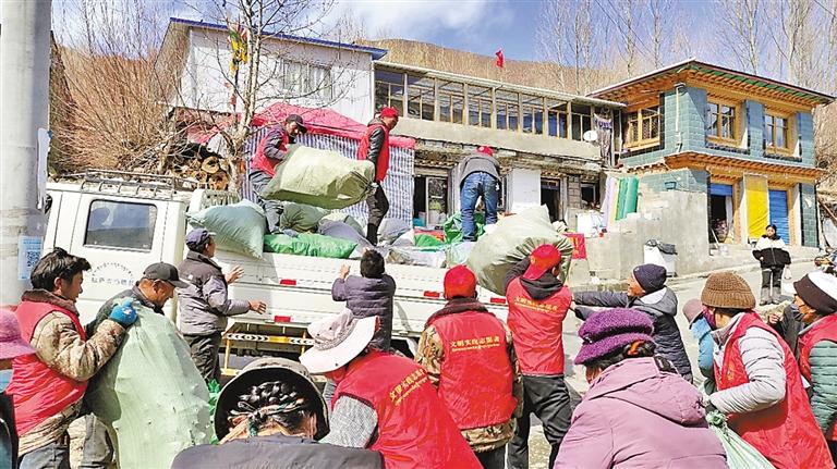 圖為朗縣登木鄉(xiāng)新時(shí)代文明實(shí)踐志愿者將清理出來的垃圾裝車。記者 史金茹 攝