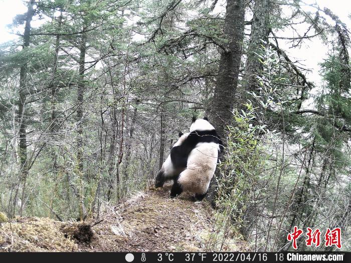 為了打敗競爭者,平時(shí)呆頭呆腦、憨態(tài)可掬,有點(diǎn)傻萌的“滾滾”秒變“功夫熊貓”,電光火石的出拳速度和直取要害的攻擊路線,精彩激烈的拳擊、摔跤、柔術(shù)等看家本領(lǐng)統(tǒng)統(tǒng)用上,甚至為了提高自身氣勢,不惜使出“獅吼功”,試圖在氣勢上壓倒競爭對(duì)手。而這一切只是為了選擇優(yōu)秀的基因,以利于大熊貓種群在嚴(yán)酷的自然環(huán)境中繁衍生存。此次監(jiān)測視頻中,出現(xiàn)3只大熊貓同框畫面,其中兩只雄性大熊貓因爭奪交配權(quán)出現(xiàn)吼叫、打斗行為;一段視頻中,出現(xiàn)兩只大熊貓“打情罵俏”求偶交配畫面。