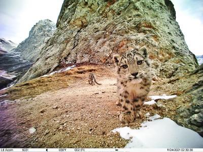 在世界屋脊研究野生動(dòng)物,免不了直面挑戰(zhàn)。雪豹喜歡陡峭的石壁和山崖,因此安放紅外相機(jī)必須克服恐高心理。2021年10月,在云塔村爬山布設(shè)紅外相機(jī)時(shí),我為了緊跟隊(duì)伍,沒(méi)來(lái)得及觀察周?chē)h(huán)境。當(dāng)穿過(guò)灌木到達(dá)監(jiān)測(cè)位點(diǎn)時(shí),才發(fā)現(xiàn)自己站在山脊線上,背后就是幾十米高的斷崖,立馬嚇得眩暈蹲下。檢查并重新安裝好紅外相機(jī)后,我們又爬完兩座山才完成了一天的工作。這一趟,我們創(chuàng)造了為追逐雪豹一天內(nèi)翻越3座山的紀(jì)錄。