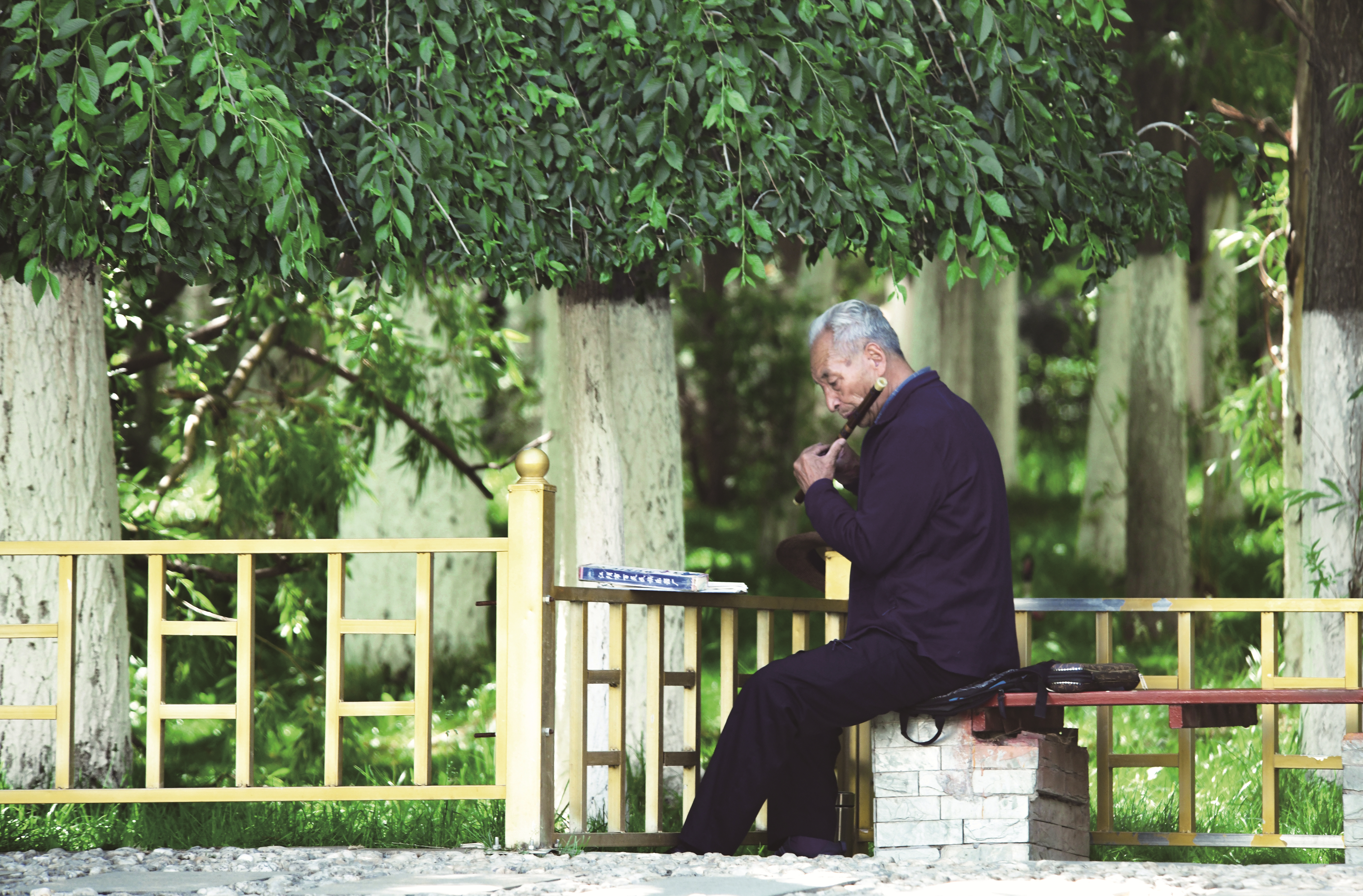 圖為宗角祿康公園里的吹笛老人。拉薩融媒記者 玉珠多杰攝