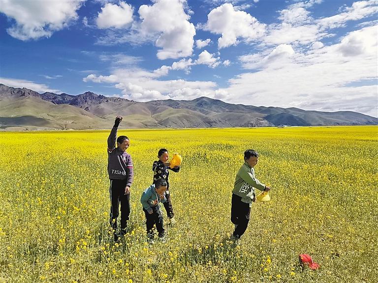 在那曲市色尼區(qū)羅瑪鎮(zhèn)凱瑪村,有一片由油菜花和披堿草共同構(gòu)成的草場(chǎng)。盛夏時(shí)節(jié),七千畝的油菜花競(jìng)相盛開,成為碧綠羌塘草原上一片金燦燦的風(fēng)景。