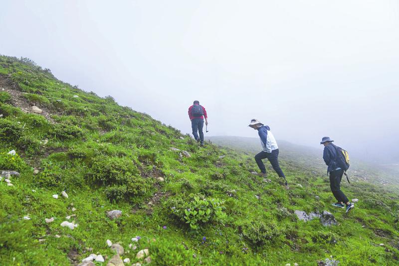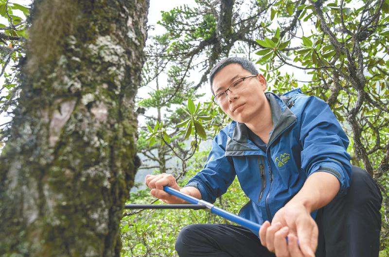 垂直距離只有300米,但密林中的行進并不容易。在向?qū)ьI(lǐng)下,王文志和其學生抵達了林線處,腳踩松軟的苔蘚,他們展開作業(yè)。