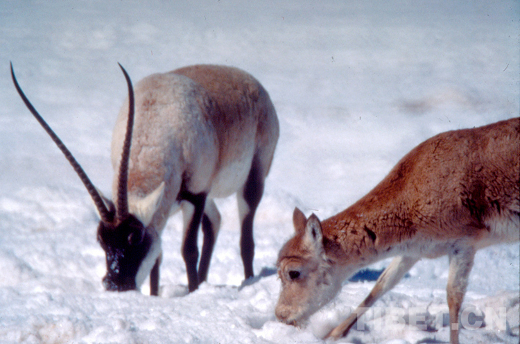 這是一對在羌塘國家級(jí)自然保護(hù)區(qū)雪地里覓食的國家一級(jí)保護(hù)動(dòng)物藏羚羊(唐召明提供,2007年6月21日攝)