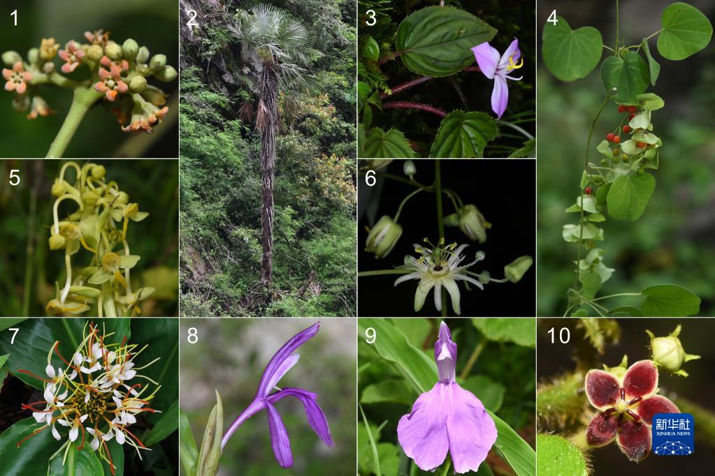 圖為:1、吉隆牛奶菜;2、塔基棕櫚;3、喀西蜂斗草;4、旋花錫生藤;5、吉隆角盤蘭;6、尼泊爾西番蓮;7、橢穗姜花;8、藏南象牙參;9、象牙參;10、箭藥藤(中國科學院西雙版納熱帶植物園供圖)