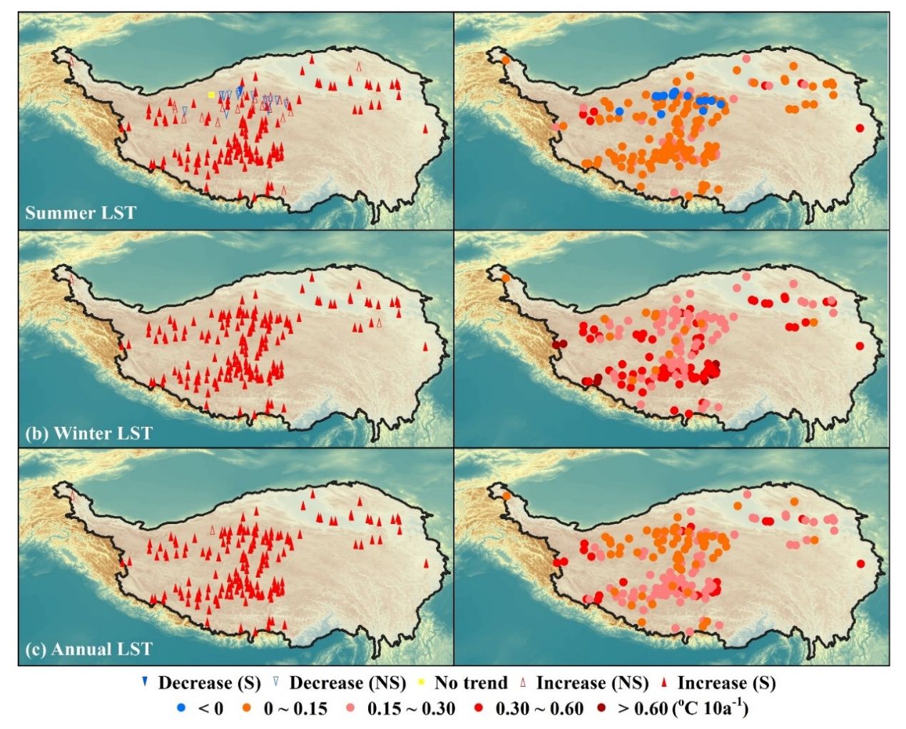 基于重建的湖面溫度時間序列,團隊揭示了青藏高原湖面溫度的時空演化規(guī)律。研究發(fā)現(xiàn),近40年來(1978—2017年)青藏高原絕大多數(shù)湖泊的表面溫度均呈上升趨勢,升溫速率約每10年0.01~0.47℃,且冬季升溫比夏季更顯著,南部湖泊升溫速率高于北部湖泊。此項研究成果對于未來進一步評估氣候變化對青藏高原湖泊水熱收支變化的影響具有重要價值。