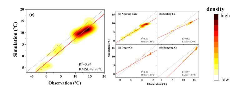 湖泊水溫是區(qū)域水分與能量平衡的重要變量,也是湖泊水生生態(tài)系統(tǒng)的控制性參數(shù)。由于常規(guī)地面觀測的局限,青藏高原湖泊水溫觀測數(shù)據(jù)普遍缺乏。團隊集成遙感與數(shù)值模擬技術(shù),發(fā)展了水溫數(shù)據(jù)重建的技術(shù)框架,突破了模型數(shù)據(jù)要求高而移植性差的局限,實現(xiàn)了多相態(tài)(冰、水、冰水混合)下湖泊水溫的動態(tài)模擬,揭示了青藏高原湖泊水溫的時空演化規(guī)律及其對氣候變化的響應(yīng)。