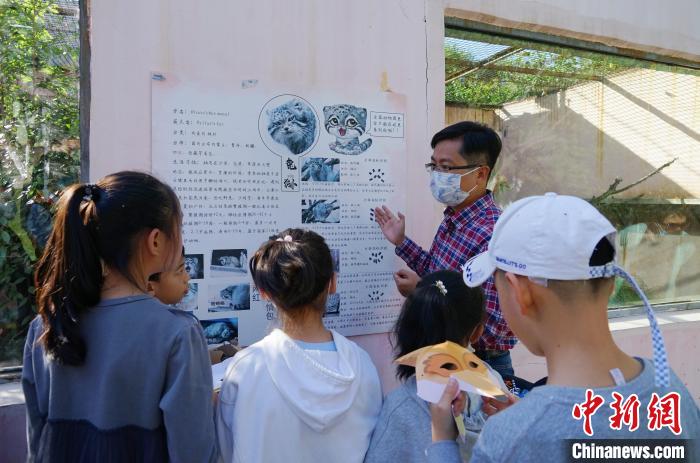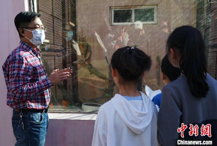 圖為青海野生動(dòng)物救護(hù)繁育中心副主任向?qū)W生介紹荒漠貓。 馬銘言 攝