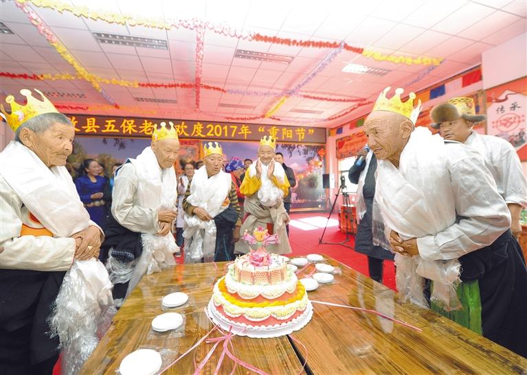 社會保障兜底一批。2021年,農(nóng)村居民最低生活保障標(biāo)準(zhǔn)達到5060元/年/人,城鎮(zhèn)居民最低生活保障標(biāo)準(zhǔn)達到10920元/年/人。圖為2017年10月28日,西藏自治區(qū)拉薩市達孜區(qū)特困人員集中供養(yǎng)服務(wù)中心為80歲老人們集體過生日。