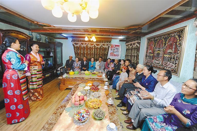 著力創(chuàng)建全國民族團(tuán)結(jié)進(jìn)步模范區(qū)。截至2022年5月,全區(qū)共有國務(wù)院、西藏自治區(qū)表彰的民族團(tuán)結(jié)進(jìn)步模范集體1934個(gè),模范個(gè)人2846人。圖為2021年2月13日,西藏自治區(qū)拉薩市吉崩崗社區(qū)各族群眾在同一天共度農(nóng)歷新年和藏歷新年。