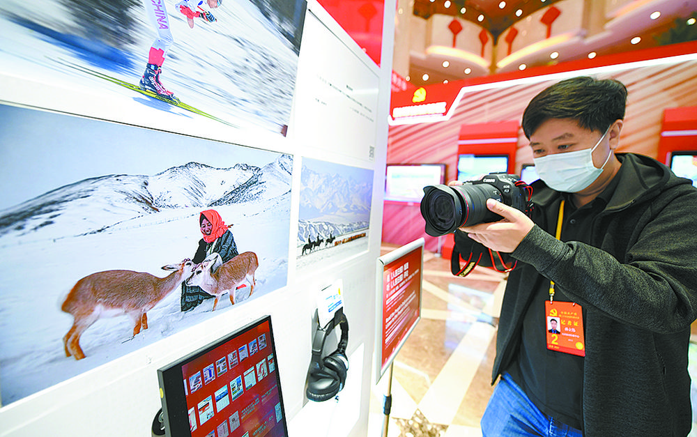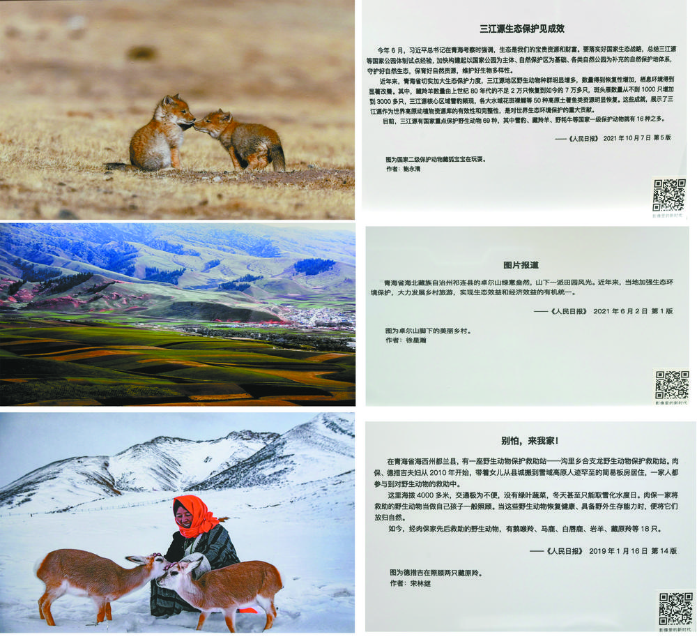 兩只憨態(tài)可掬的藏狐寶寶、卓爾山腳下的美麗鄉(xiāng)村、人與自然和諧共生的美好畫(huà)面……黨的二十大新聞中心融媒體體驗(yàn)區(qū)互動(dòng)展示墻上三張反映青海生態(tài)的照片,吸引了境內(nèi)外媒體記者的關(guān)注。 本報(bào)記者 祁國(guó)彪 魏慧敏 攝
