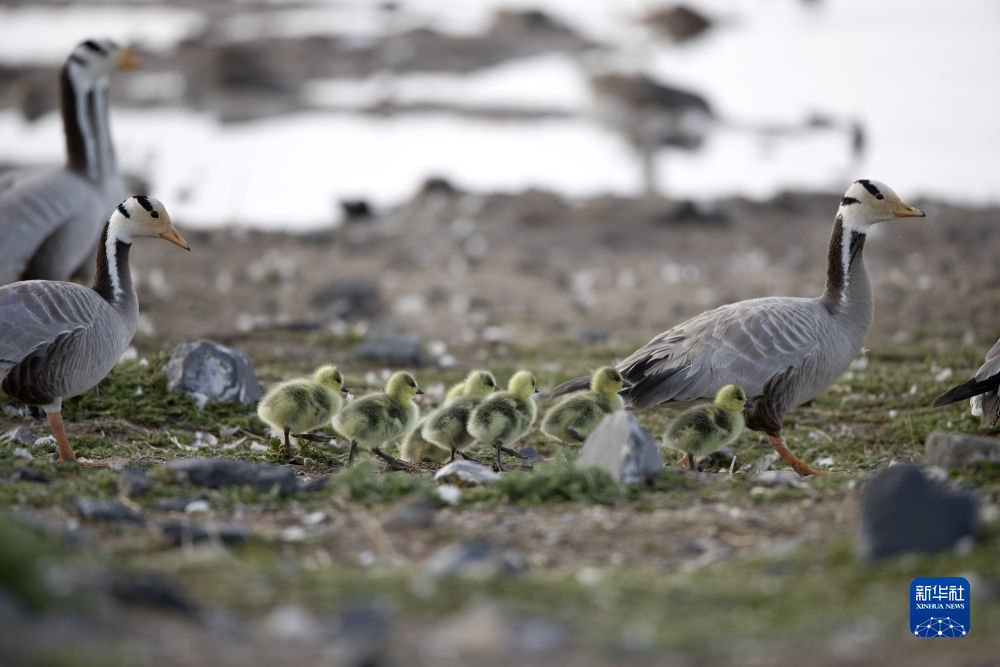 幾只斑頭雁在青海湖鳥島濕地活動(2020年6月2日攝)。新華社 星智 攝