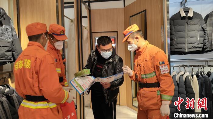 消防隊(duì)員正在向商家講解防火知識(shí)。 袁永斌 攝