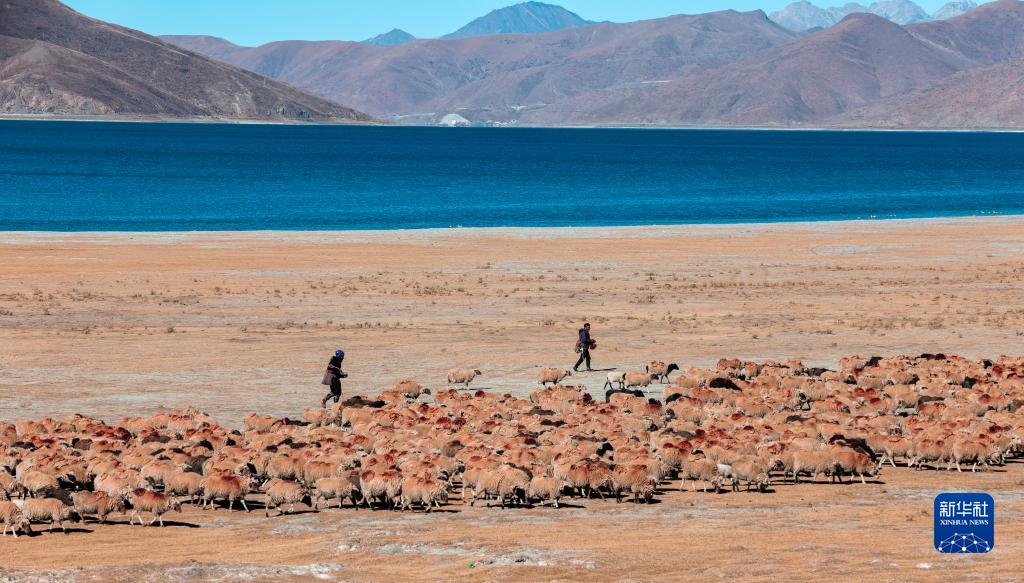 牧民在羊卓雍錯(cuò)湖邊放羊(12月11日攝)。新華社記者 姜帆 攝