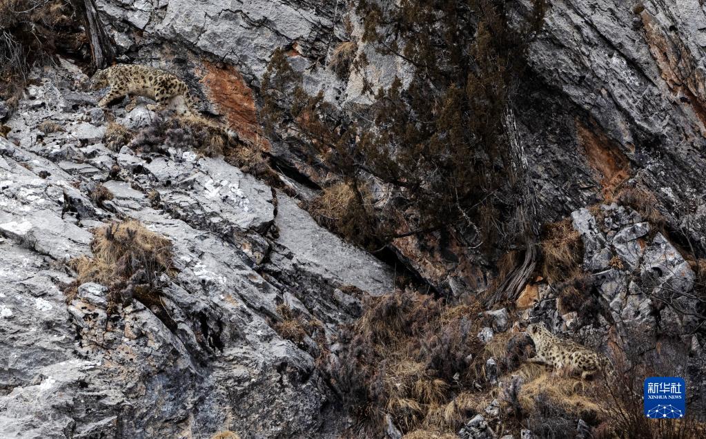 2月21日在青海省玉樹藏族自治州雜多縣昂賽鄉(xiāng)境內(nèi)的昂賽大峽谷內(nèi)拍攝的兩只雪豹。新華社記者 費茂華 攝