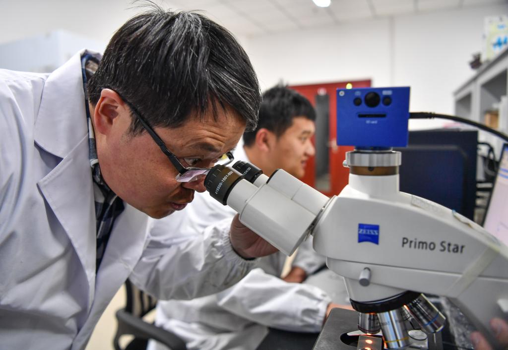 在西藏高原生物研究所,楊樂在實驗室中觀察動物標本(3月2日攝)。新華社記者 晉美多吉 攝