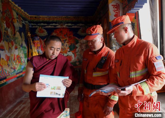 “景區(qū)內的宗教寺廟木質結構比較多,周圍森林資源豐富,平時要注意用火安全,防止火災發(fā)生?!边@是林芝市森林支隊消防員正在為德木寺景區(qū)工作人員和僧人宣傳森林消防安全常識。