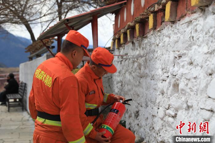 森林消防隊員檢查寺廟滅火器?!∥骼@拉翁 攝