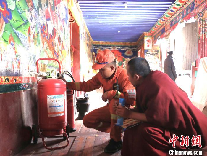 森林消防隊員為僧人講解滅火器使用方法?!∥骼@拉翁 攝