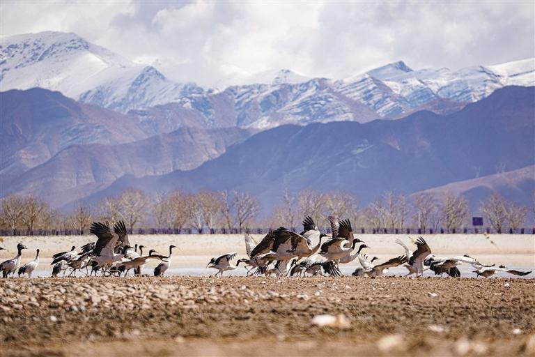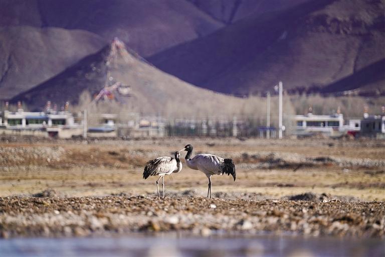 黑頸鶴是國家一級保護(hù)動物,在藏語中稱為“沖沖”。主要棲息在海拔2500米至5000米的高原、草甸、沼澤地帶。拉薩北部的林周縣平均海拔約4200米,是黑頸鶴的主要越冬地之一。最近這段時間,對拉薩市林周縣野保員們來說,一邊要忙自家的農(nóng)活,一邊還要巡查候鳥情況?!耙呀?jīng)有一小部分飛走了,估計再過半個月都會陸續(xù)飛走?!?月23日上午,野保員旦增告訴記者,在虎頭山水庫和卡孜水庫越冬的候鳥有一部分已經(jīng)飛走了。野保員口中的“飛走”便是遷徙,遷徙是候鳥的本能,一年一年,跟隨時間的召喚,完成兩次遷徙:繁殖和越冬。
