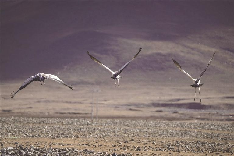 在西藏,黑頸鶴從越冬地到繁殖地有兩條線路:一條是拉薩到色林措,另一條則是從日喀則到色林措。整體來說,是從雅魯藏布江中游河谷黑頸鶴國家級自然保護(hù)區(qū)飛往色林措黑頸鶴保護(hù)區(qū),兩個保護(hù)區(qū)之間有一條固定的黑頸鶴遷徙路線,每年黑頸鶴會在3月中旬從越冬地雅江中游河谷及其支流拉薩河、年楚河流域的“一江兩河”地區(qū),飛去羌塘北部草原繁育后代;又會于11月中旬從繁殖地那曲的班戈縣、申扎縣、嘉黎縣,阿里的日土縣、普蘭縣,日喀則的昂仁縣,拉薩的當(dāng)雄縣返回到越冬地。對于雅江中游河谷來說,它是冬候鳥;對于羌塘北部草原來說,它是夏候鳥。