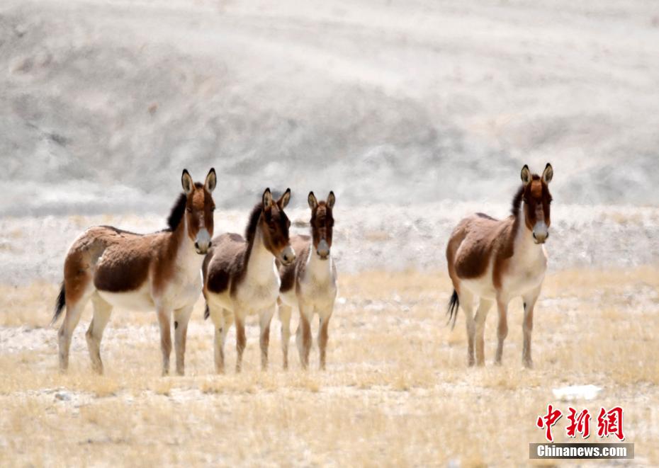 4月10日,西藏阿里地區(qū)札達縣拍攝到的藏野驢。藏野驢為國家一級重點保護動物、青藏高原特有物種。藏野驢是我國野驢中體型最大的一種,外形與蒙古野驢相似,但要比蒙古野驢大許多,而且性格也比蒙古野驢兇悍。它的四肢和身體下側,包括頸下方白色,耳朵內(nèi)側和口鼻端也是白色。在背脊上,一條深色條紋從鬃毛處一直延伸到尾端,尾巴上有一簇黑色細絲狀的毛。近年來,隨著西藏生態(tài)保護力度不斷加大,藏野驢等多種野生動物頻頻亮相。