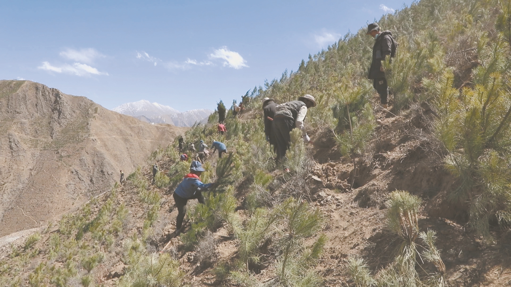 駝鈴叮當(dāng),跟著馱著樹(shù)苗的馬隊(duì)爬山一個(gè)多小時(shí),記者來(lái)到了拉薩南北山綠化工程項(xiàng)目南山公園一號(hào)片區(qū)的后山,爬上山頂,與布達(dá)拉宮遙遙相望,拉薩市區(qū)的景色盡收眼底。在這里,幾十名群眾正在栽種馬隊(duì)馱上來(lái)的樹(shù)苗,在挖好的坑里回填泥土,將樹(shù)苗放進(jìn)去,扶正填土,再踩實(shí)覆土,大家有的種樹(shù),有的澆水,步驟熟練、配合默契。在他們的努力下,原本光禿、山石裸露的山體已經(jīng)披上了綠裝。來(lái)自曲水縣的尼瑪是南山公園的護(hù)林員,拉薩南北山綠化工程項(xiàng)目實(shí)施后,他加入了其中,在南山公園一號(hào)片區(qū)種樹(shù)護(hù)苗。