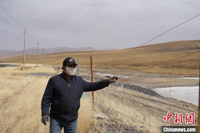 今年3月,久買正在查看種草復(fù)綠區(qū)域的網(wǎng)圍欄?!≈行律缬浾?李雋 攝