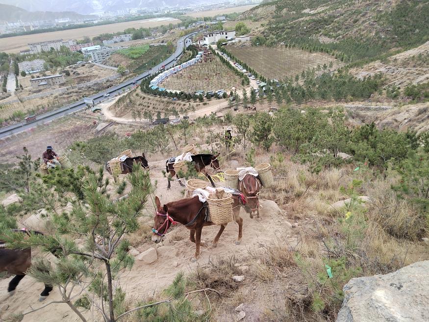 圖為騾隊(duì)在綠化片區(qū)運(yùn)輸樹(shù)苗 圖片來(lái)源:西藏自治區(qū)慈善總會(huì)官網(wǎng)